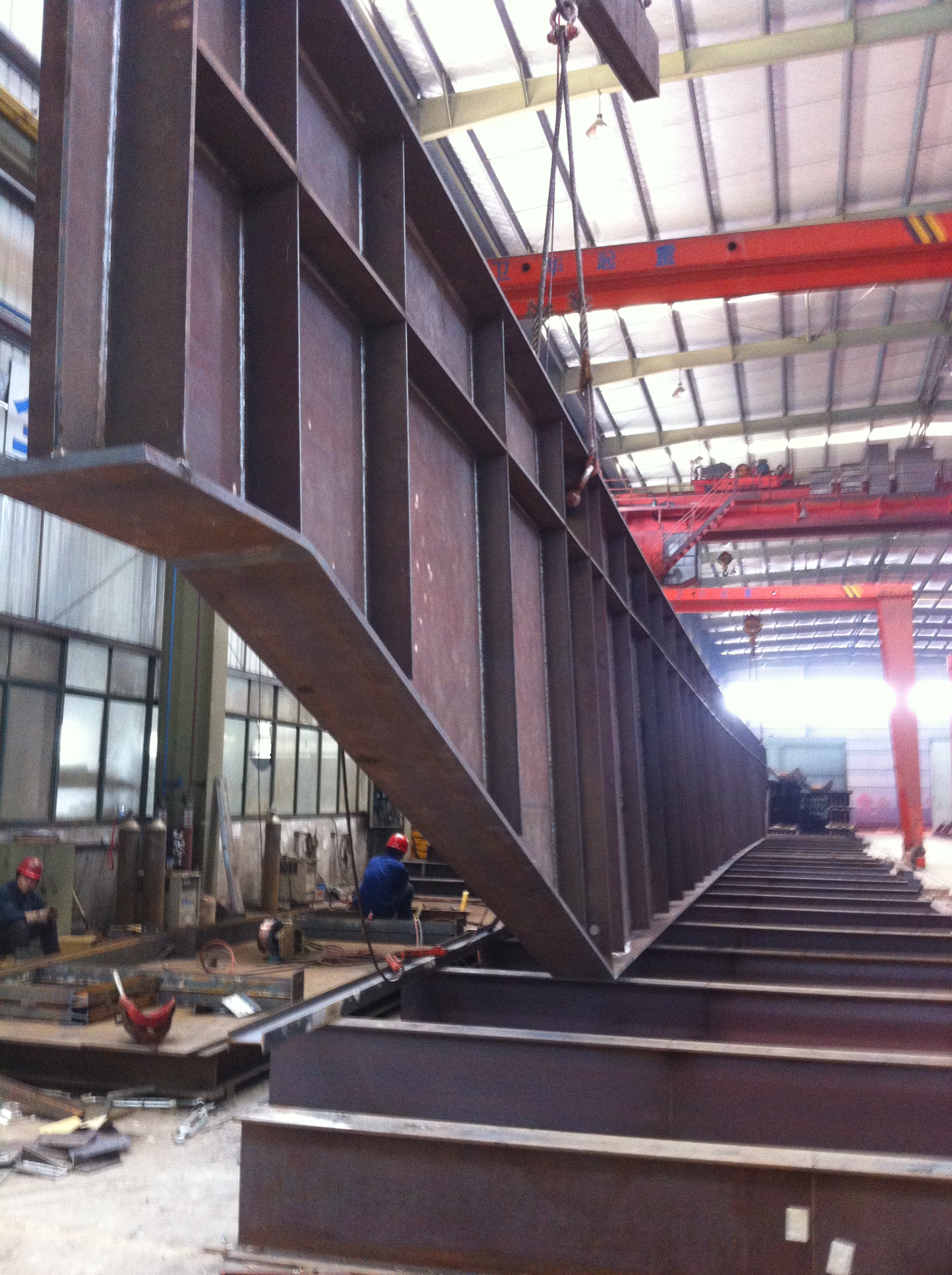 由于5000噸換熱管項目設備的特殊性,設計采用連抽五柱的形式,使得周?chē)鷺嫾a(chǎn)生了超大載荷,其中就出現了45米長(cháng)的吊車(chē)梁和桁架,以及多個(gè)異型柱??缍冗_到45米的構件在制作過(guò)程中給我們帶來(lái)了全所未有的挑戰。期間,公司領(lǐng)導層多次蒞臨施工現場(chǎng)進(jìn)行考察,對此項目給予極高重視。